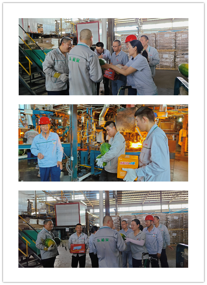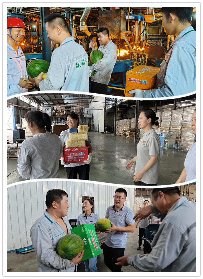 由于曜暉所處行業(yè)比較特殊,從原料粉末、熔化、玻璃液到成品,整個生產(chǎn)流程都需在高溫環(huán)境下實現(xiàn)。合影結(jié)束后,黨員代表深入車間現(xiàn)場開展迎“七一”送清涼活動,將濃濃關(guān)懷送到職工心坎上,代表們來到車間,把清涼的大西瓜、飲料、菊花茶等防暑降溫物品送到員工手中,為他們帶去絲絲涼意。雖然工作環(huán)境高溫悶熱,但工人們認(rèn)真積極工作的態(tài)度始終如一,令人敬佩。